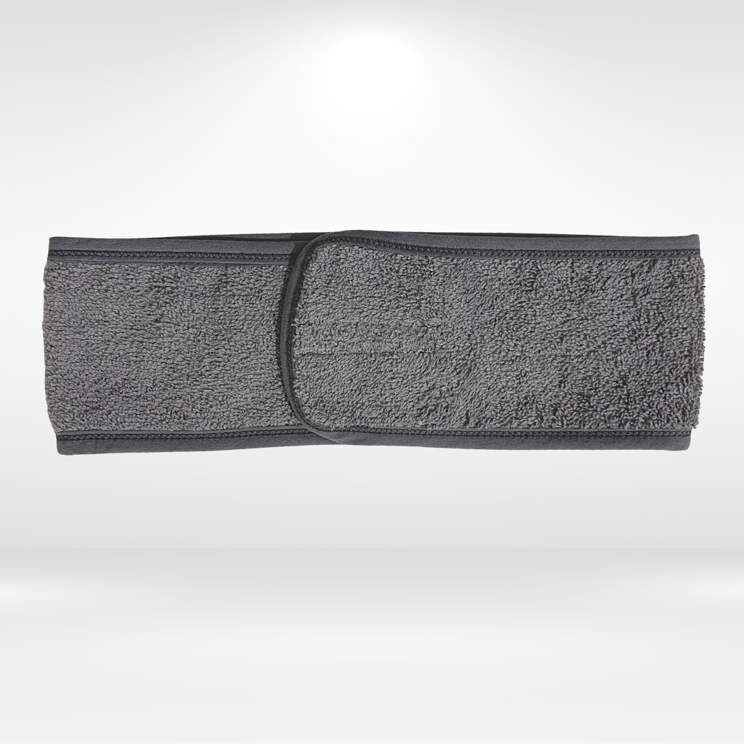 Gri havlu saç bandı, %100 pamuk dokusuyla, 30 gr ağırlığında ve 500 GSM yoğunluğunda üretilmiştir.
